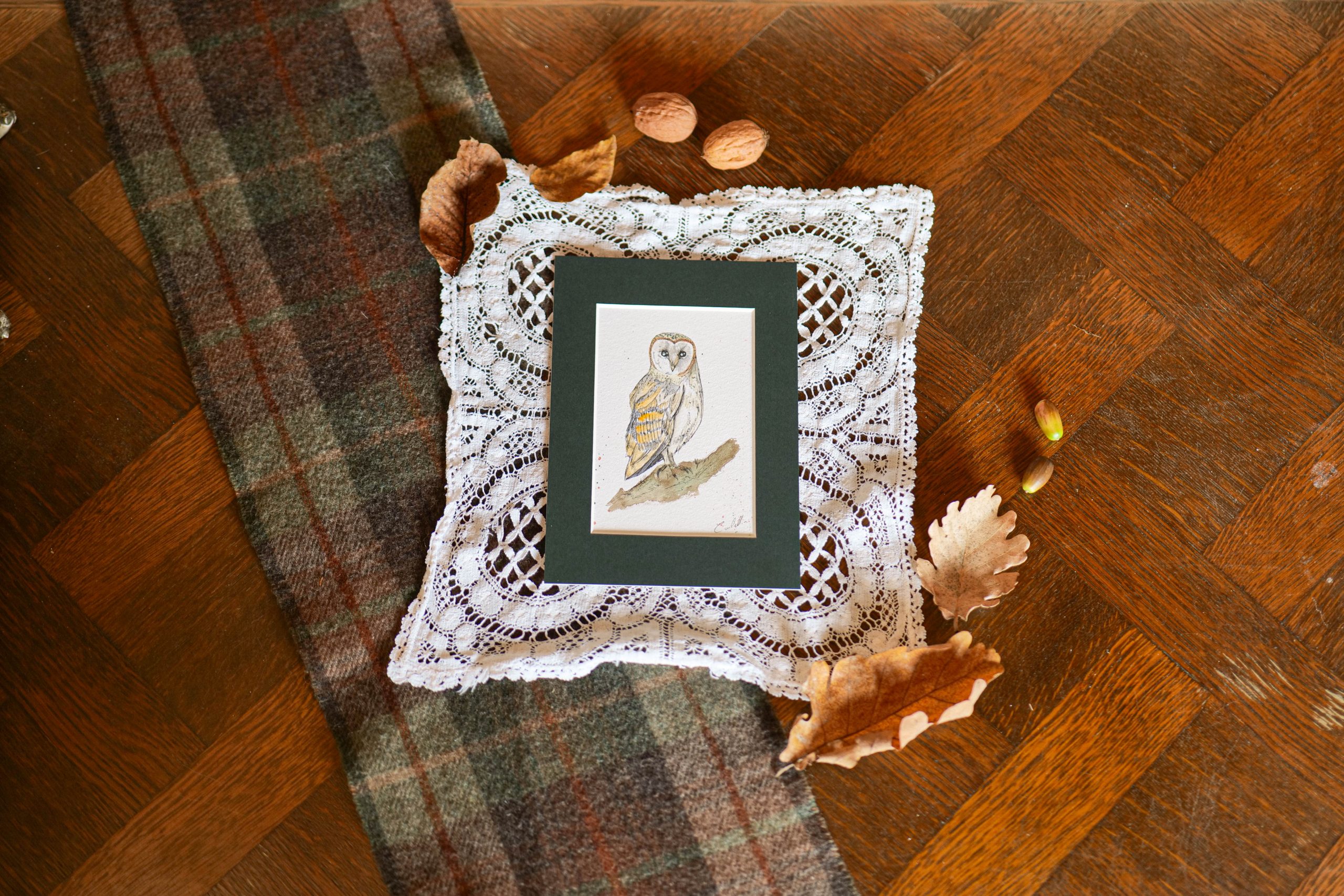La chouette incarne la nuit d’automne, le silence habité et la vigilance discrète des forêts. Cette aquarelle de la collection Animaux d’automne en capture la présence immobile, ses plumes baignées d’ombres douces et son regard lumineux perçant l’obscurité. L’eau et les pigments révèlent une atmosphère feutrée, où mystère et poésie se rencontrent.